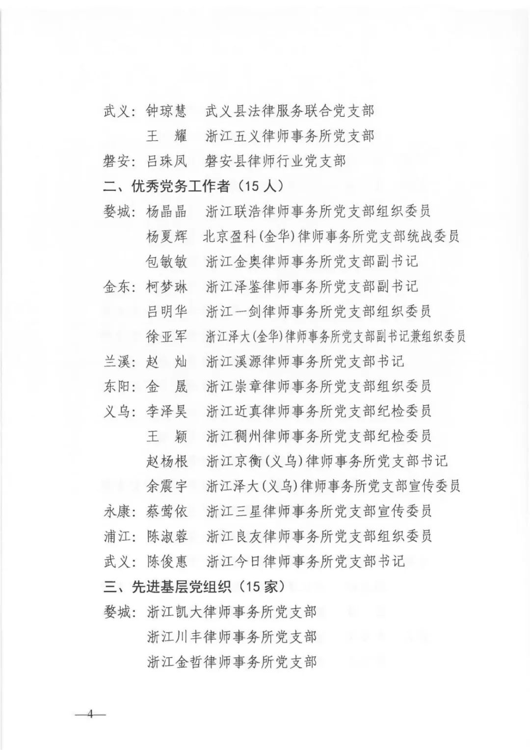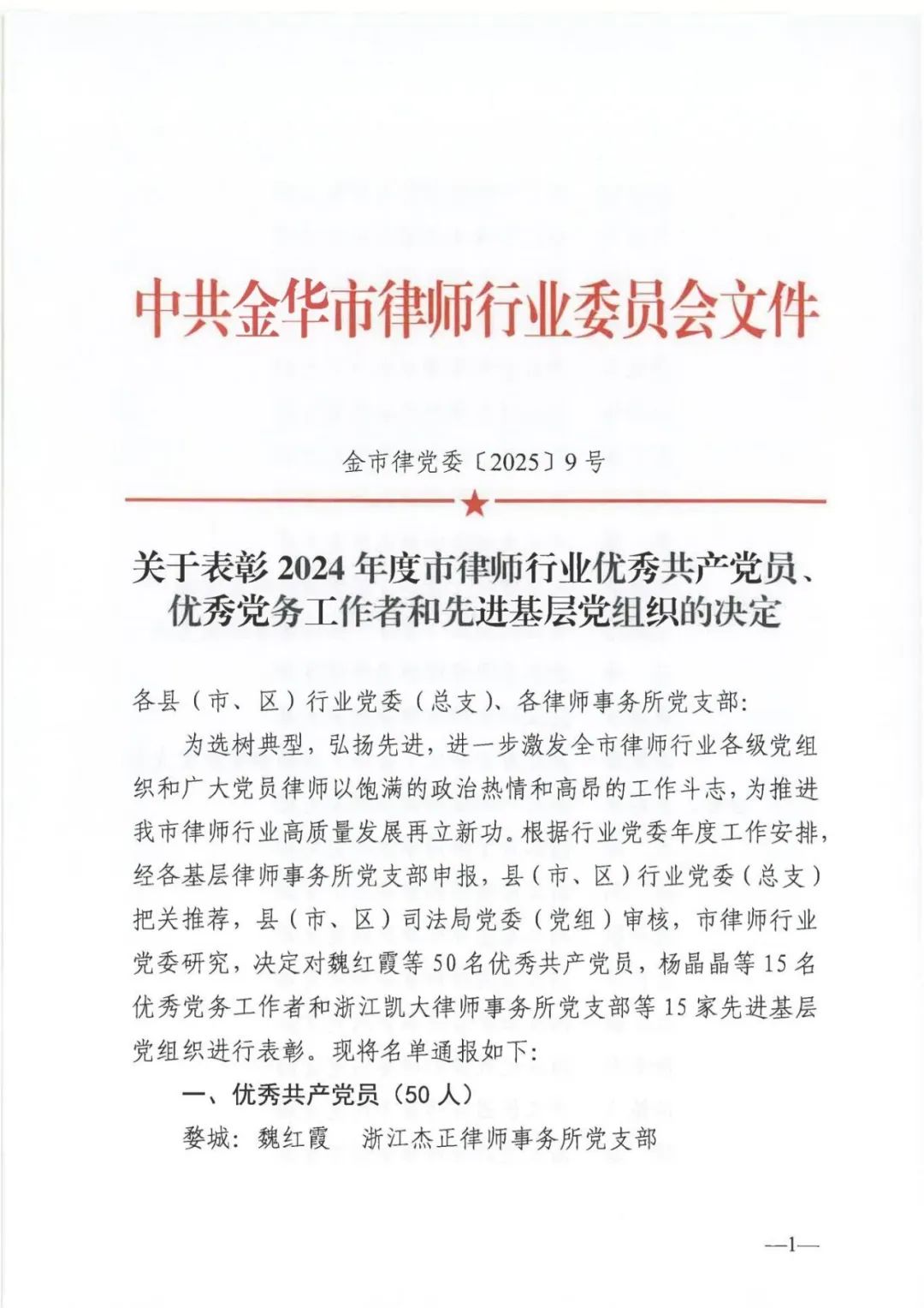 为选树典型,弘扬先进,进一步激发全市律师行业各级党组织和广大党员律师以饱满的政治热情和高昂的工作斗志,为推进我市律师行业高质量发展再立新功,2025年7月1日,金华市律师行业党委下发文件,决定对50名优秀共产党员、15名优秀党务工作者和15家先进基层党组织进行表彰。