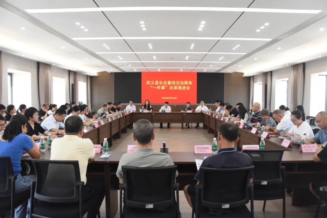 0579-82465239根据省委依法治省办《关于深入推进涉企法治服务“一件事”改革助力打造营商环境最优省的指导意见》文件要求及市委八届六次全会精神,金中法〔2024〕56号《关于进一步深化企业重组法治服务“一件事”工作的意见》精神,2025年8月26日,武义县人民法院、武义县司法局、武义县企业综合服务中心邀请金华市中级人民法院、金华市司法局、金华市企业重组法治服务中心前往武义调研座谈,推进武义县企业重组法治服务“一件事”改革,积极助企脱困,减轻企业负担,为武义县经济高质量发展注入新动力。武义县相关职能部门、乡镇街道分管领导,行业协会、金融机构、律师事务所、会计师事务所、税务师事务所负责人等40余人参加会议。