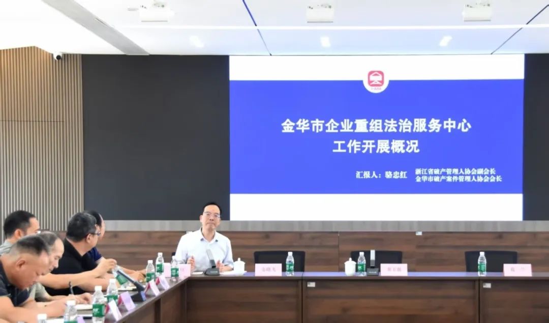 浙江省破产管理人协会副会长、金华市破产案件管理人协会会长、金华市企业重组法治服务中心首席专员、浙江振进律师事务所主任骆忠红律师在会上从金华市企业重组法治服务中心成立背景、组织架构、主要做法、运行模式、优秀案例和服务效果等几个方面,结合我市企业重组案件实例,全面系统地介绍了企业重组法治服务的功能及运作模式,为来场嘉宾提供了宝贵的经验和启示。与会人员围绕企业重组法治服务中的难点、痛点问题向骆忠红主任提问,并进行了深入交流与探讨,就如何进一步优化服务流程、提升服务质量、强化部门协同等方面提出了许多建设性的意见和建议。