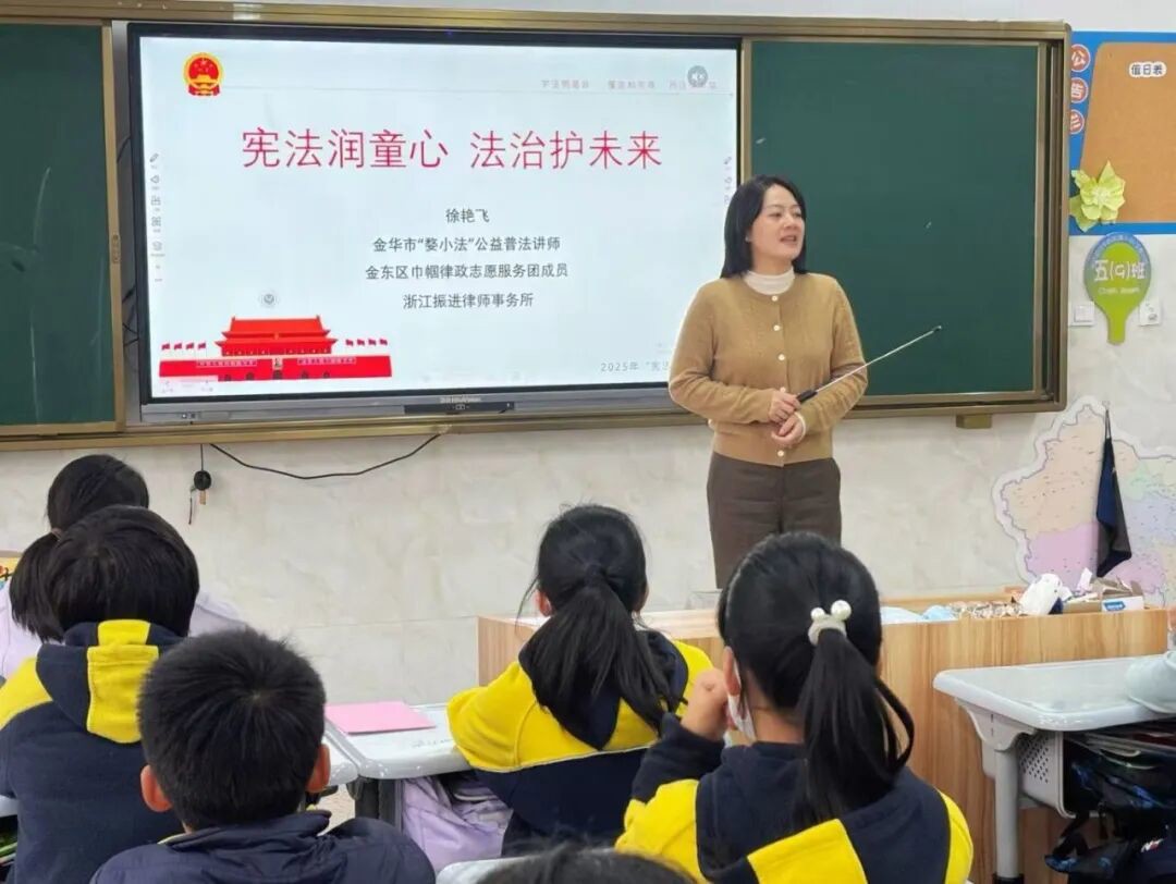 0579-82465239在第十二个国家宪法日来临之际,为让法治种子在青少年心中生根发芽,2025年12月2日下午,我所徐艳飞律师受邀前往金华师范学校附属小学凤山校区,开展了一场以“宪法润童心,法治护未来”为主题普法知识课。