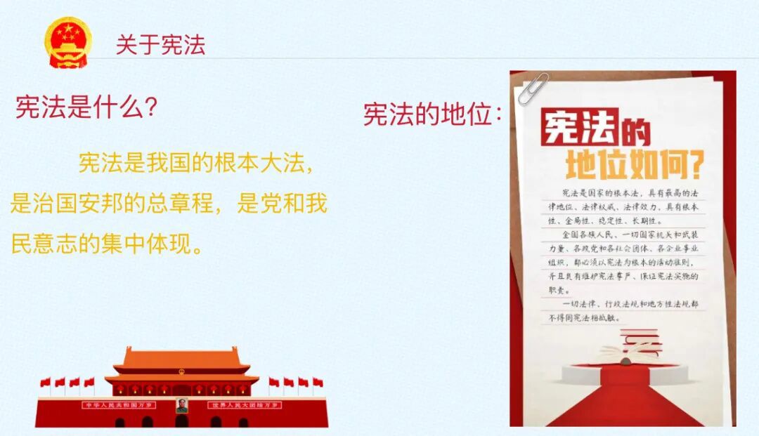 课堂伊始,徐艳飞律师以“法律职业共同体”为切入点,用通俗易懂的语言,介绍了警察、检察官、法官、律师的工作单位、核心职责与职业性质,让同学们对法治工作者的日常有了具象化认知。 随后,徐艳飞律师从“法”的由来引入宪法主题,层层递进地讲解了“宪法是什么”“宪法在法律体系中处于什么地位”“宪法如何保护我们的生活”等知识,以贴近校园生活的生动案例讲述抽象的法律概念。