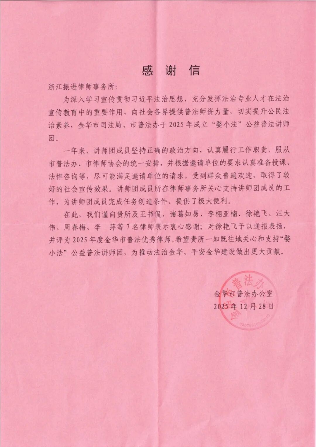 0579-82465239近日,振进所收到金华市普法办公室发来的感谢信,信中提及我所多名律师作为“婺小法”公益普法讲师团成员, 能坚持正确的政治方向,认真履行工作职责,服从市普法办、市律师协会的统一安排,并根据邀请单位的要求认真准备授课、法律咨询等,尽可能满足邀请单位的请求,受到群众普遍欢迎,取得了较好的社会宣传效果。律所关心支持讲师团成员的工作,为讲师团成员完成任务创造条件、提供了极大便利。