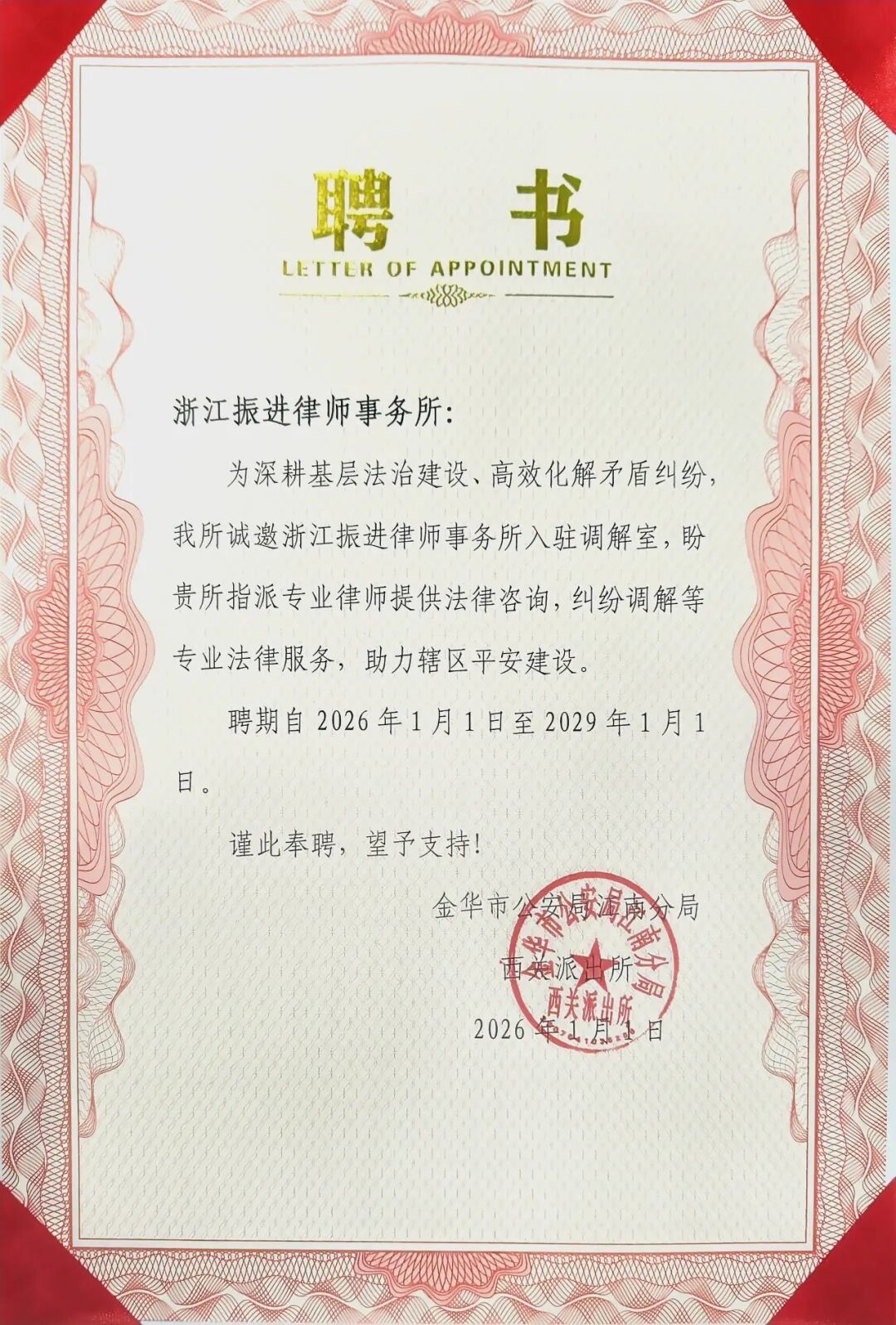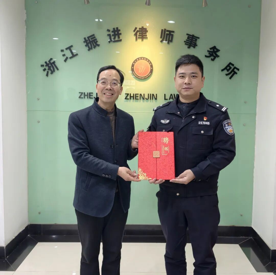 交流后,何国帅所长代表西关派出所向我所致送聘书,正式邀请浙江振进律师事务所参与派出所调解室工作。何所长表示,警律协作机制的建立有助于发挥各自专业优势,为群众提供更加优质高效的法律服务,推动矛盾纠纷及时妥善化解,切实提升辖区社会治理水平。